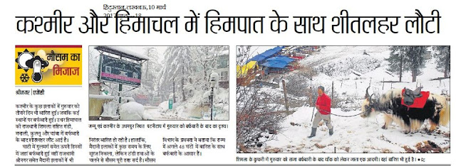 हिंदुस्तान, लखनऊ, 09 मार्च 2017 , पृष्ठ --- 14 पर प्रकाशित समाचार में बताया गया है कि, " पहाड़ों पर अगले तीन दिन बारिश - बर्फबारी " लेकिन नीमच के 'चंड - मार्तंड ' पंचांग ने जो बहुत पहले ही प्रकाशित हो चुका था के पृष्ठ 54 और 55 पर 11 फरवरी से 12 मार्च 2017 और आगे के विषय में स्पष्ट लिख दिया था :